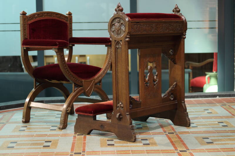 De Bidstoel is versierd met neogotische motieven. Het heeft opengewerkt front met aan de knielzijde, een een amandelvormig medailon, een voorstelling van een orante figuur met daarboven de tekstregel "De matitudine usque ad noctem". Aan de andere zijde bladranken . Op de zijkanten zijn venstertraceringen en bovenaan een madaillon met respectievelijk een haan en een adelaar.