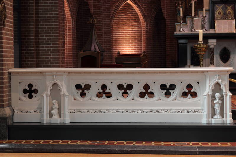 In de jaren 60 zijn deze communiebanken, 2 stuks, verwijderd uit het kerkgebouw. Deze twee communiebanken zijn door de aannemer Vendrig in opslag genomen, misschien wel met de gedachten “ooit…”. Met de herinrichting in 2016 zijn deze communiebanken weer van zolder gekomen en door aannemer Vendrig weer teruggeplaatst in het kerkgebouw.